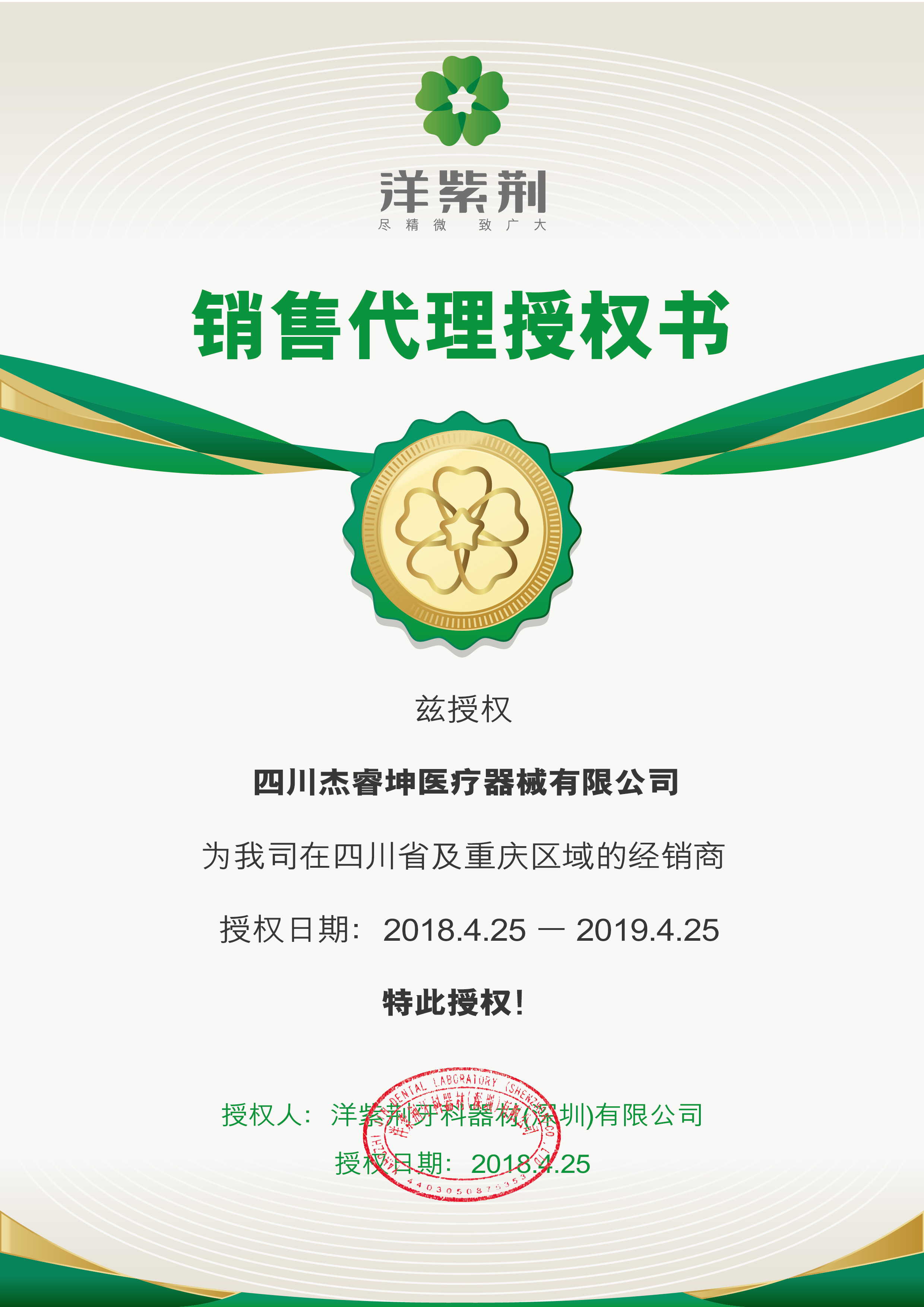 2018年4月中洋紫荆牙科器材(深圳)有限公司正式授权给四川杰睿坤医疗器械有限公司,为我司在四川省区域的经销商。授权日期:2018年4月25日-2019年4月25日。2018-06-01 -