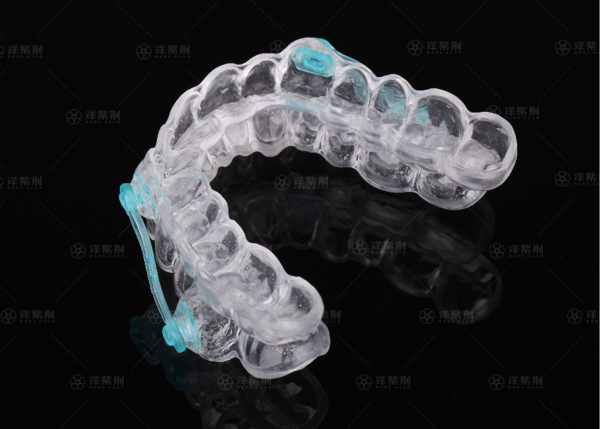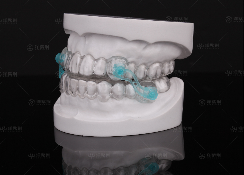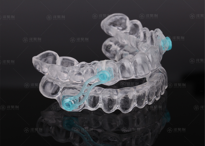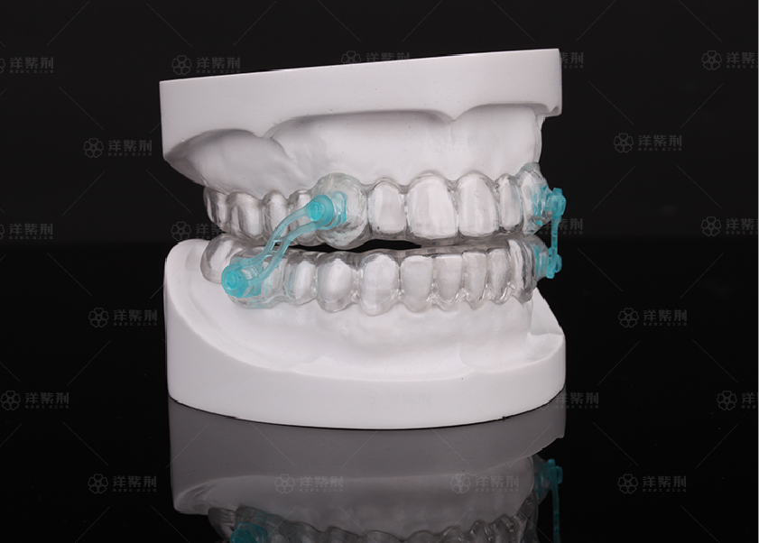 * 防鼾器在加工初期, 上下颌在正中合的基础上下颌前移2mm左右固定可调杆, 医生按临床需要更换可调杆长度, 可调杆越短, 下颌越往前, 可调杆越长, 下颌越往后,睡眠前戴上。
